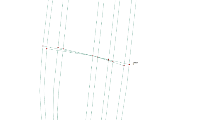 Diese Kandidaten werden nun mit einer Dummy-Kante mit der Primärstation (= die am besten gematchte Station) verbunden. Konkret heißt das z.B. im Schienennetz, dass wir Zügen erlauben, in Stationen die Gleise zu wechseln. Ohne diese Spezialkante wäre eine erfolgreiche Routensuche nur in den wenigsten Fällen möglich. Unten ist der Bahnhof Olten mit eingeblendeten Spezialkanten zu sehen.